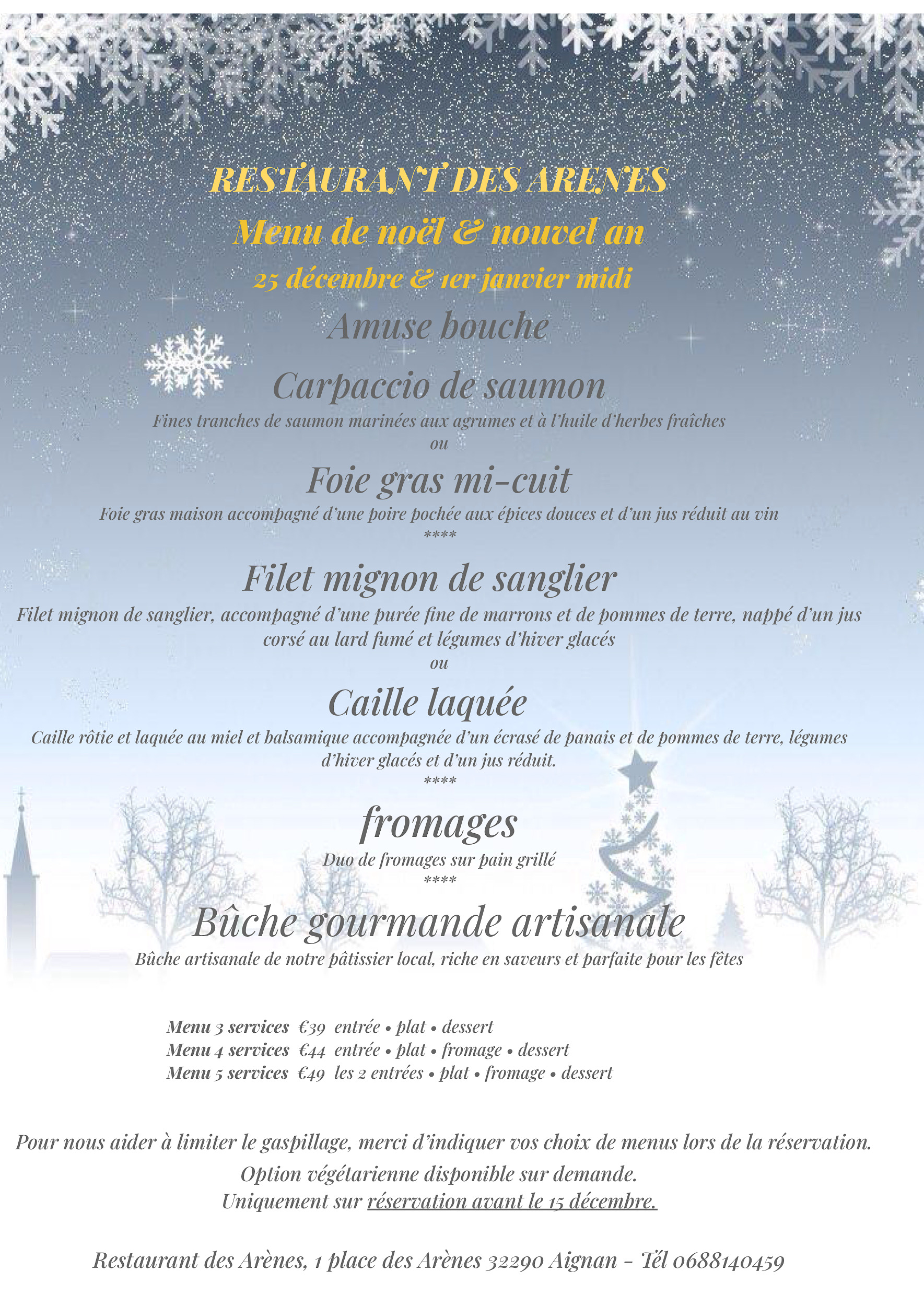 Bienvenue au Restaurant Des Arènes, où nous vous proposons des recettes savoureuses, préparées avec soin, dans une atmosphère chaleureuse et authentique.